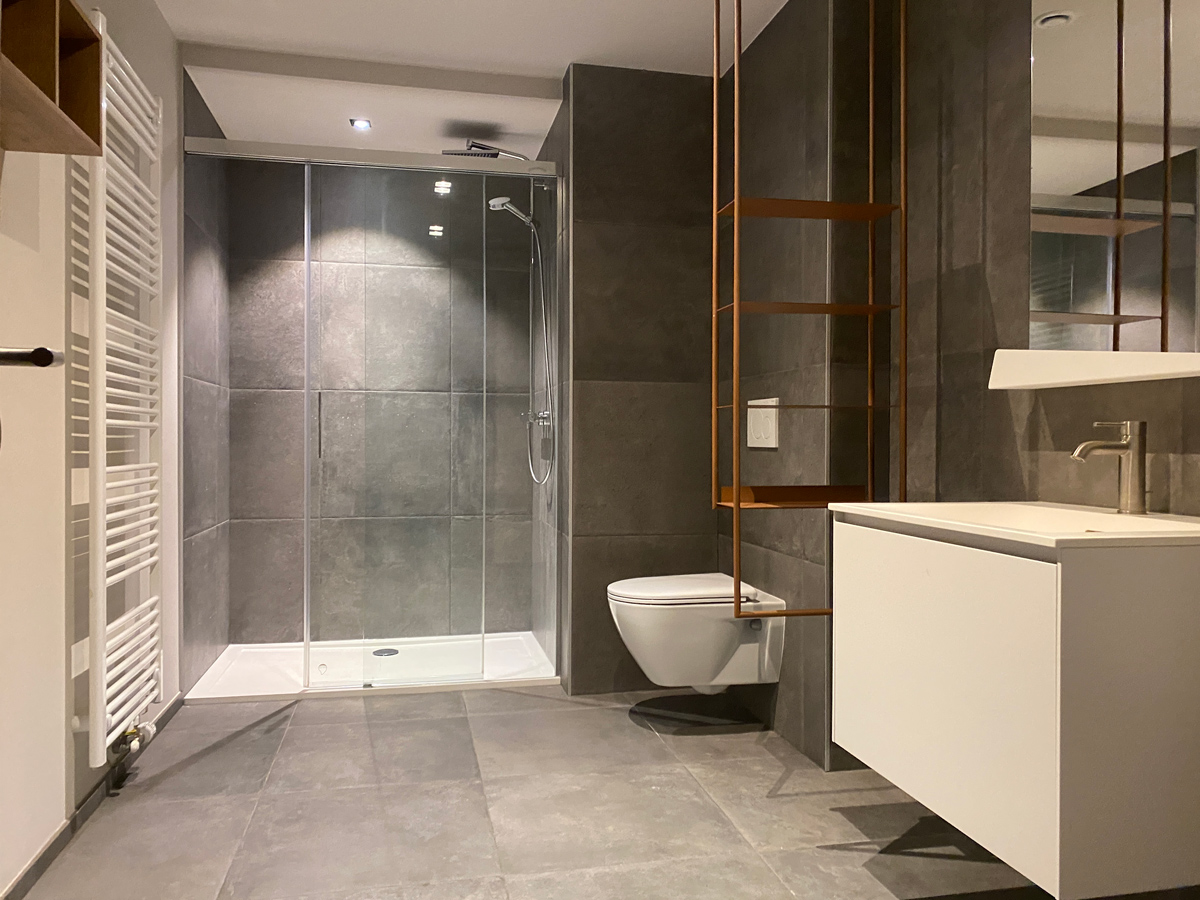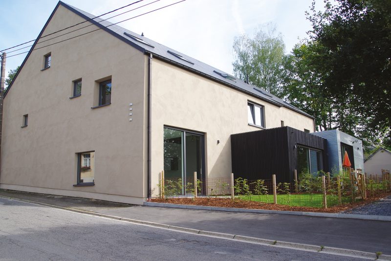 Afin de moderniser l’ancienne ferme, Christophe Berkhout a fait appel à Jean-Philippe Servatius de la société Grandjean, une entreprise spécialisée dans la construction. Ensemble, et avec l’appui d’un excellent architecte, ils ont esquissé un projet d’envergure : transformer une ancienne ferme en quatre maisons triplex et, en parallèle construire, sur le terrain situé à côté, un bâtiment flambant neuf. « L’idée était d’apporter une cohérence entre les deux bâtisses. Nous avons donc utilisé les mêmes matériaux, comme ce crépi à l’ancienne qui recouvre les deux façades auxquelles nous avons ajouté des touches de bois, noir pour la vieille ferme, en cèdre pour la nouvelle construction », explique Jean-Philippe Servatius.